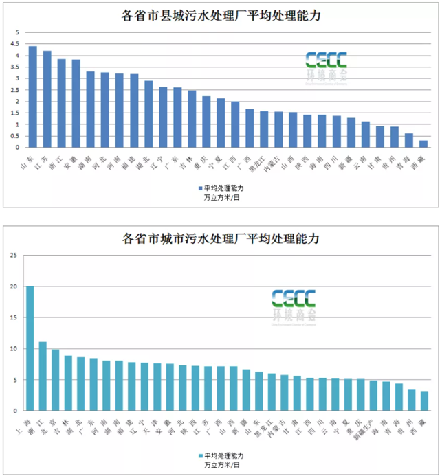 上一篇中提到的城市污水廠平均污水處理能力來看,除開上海的平均污水處理能力達20萬噸/日外,浙江省城市污水廠平均處理能力達11萬噸/日,吉林、湖北、廣東、河南、湖南等省市城市污水廠平均處理能力排在靠前的位置,大約在8萬噸/日。可以看到,浙江省在城市和縣城的污水廠平均處理能力都排在前列,可見污水廠單體規模相對較大。山東、江蘇、安徽縣城污水處理廠平均處理能力較大,而城市污水處理廠則處在全國的中等水平。