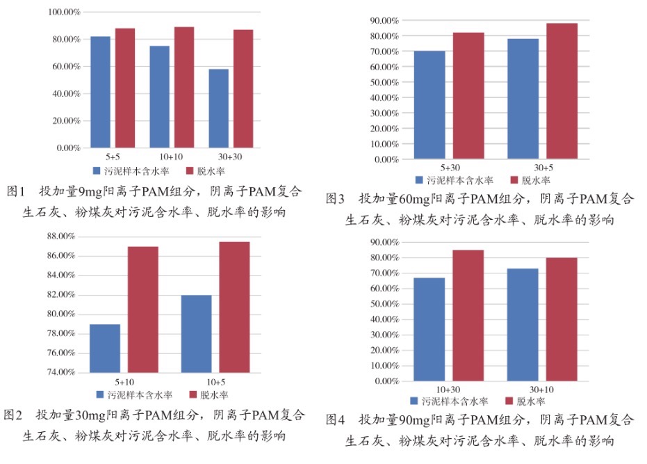 如圖1、圖2、圖3、圖4所示,分別為投加量為9mg、30mg、60mg、90mg的陽(yáng)離子pam組分,陽(yáng)離子pam 復(fù)合生石灰、粉煤灰對(duì)污泥含水率、脫水率的影響。